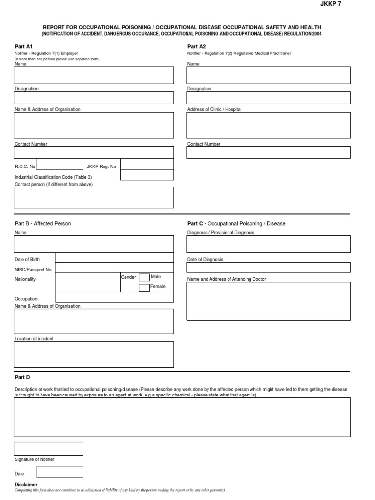 Borang Pemberitahuan Keracunan Pekerjaan dan Penyakit Pekerjaan a Majikan bagi mana-mana orang yang mengidap dari sebarang keracunan pekerjaan atau penyakit pekerjaan seperti yang disenaraikan dalam Jadual Ketiga Peraturan atau Jadual 16 garispanduan ini hendaklah melaporkan ke pejabat JKKP yang terdekat dengan menggunakan borang JKKP 7 dalam. Laporan Ringkas Penyakit dan Keracunan 2. Borang ini dikehendaki di bawah Peraturan 10 Peraturan Keselamatan dan Kesihatan Pemberitahuan Kemalangan Kejadian Berbahaya Keracunan Pekerjaan dan Penyakit 2004 dan hendaklah di simpan di tempat kerja selama 5 tahun.