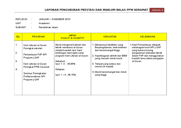 9687 10 orang 5A Guru Terlibat 1. Jadual 33 Maklumat Informan Kajian 108 Jadual 34 Kaedah Kajian Mengikut Objektif dan Persoalan Kajian 113 Jadual 51 Kaedah Pengurusan Elemen Kepimpinan dan Perancangan Strategik 170 Jadual 52 Visi dan Misi Institusi 173. Memberi Kesedaran Kepada Ibubapa Tentang pembelajaran Anak-anak BIL PROGRAM TJAWAB TEMPOH HARI KOS SUMBER.