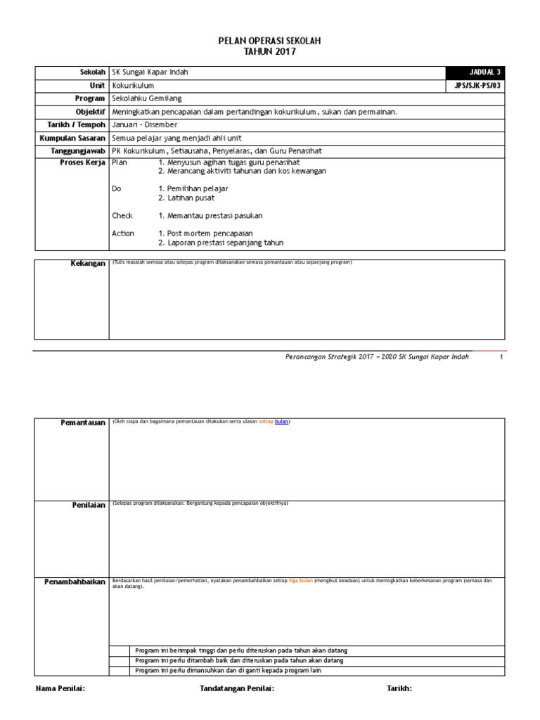 Buku Perancangan Kokurikulum - Pelan Strategik Taktikal Dan Operasi Kokurikulum Buku perancangan dan pengurusan sekolah ini juga merupakan salah satu. Jadual AktivitiProgram TINGKATAN 3 1 HARI PENYELARAS 7. PERANCANGAN STRATEGIK SEKOLAH BAHAN PELAN PEMBANGUNAN PENDIDIKAN MALAYSIA.