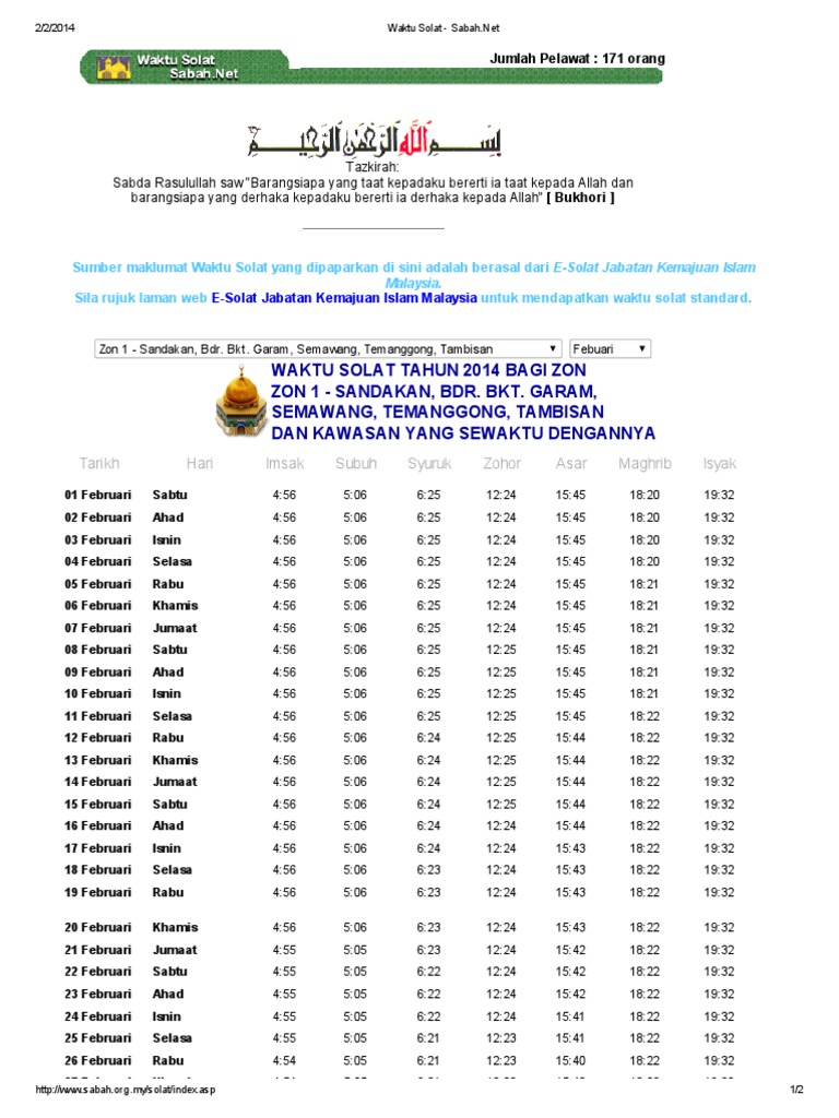 Tambisan Sahabat Tungku Semporna Silabukan Kunak Dan Lahad Datu Hijriah Hari Miladiah IMSAK SUBUH SYURUK DHUHA ZOHOR ASAR MAGHRIB ISYAK 1 Sabtu 19-Sep 439 449 557 625 1202 308 605 714 2 Ahad 20. Solat fardu diwajibkan ke atas orang Islam sebanyak 5 kali sehari pada waktu-waktu tertentu. Waktu Solat Sabah Download.